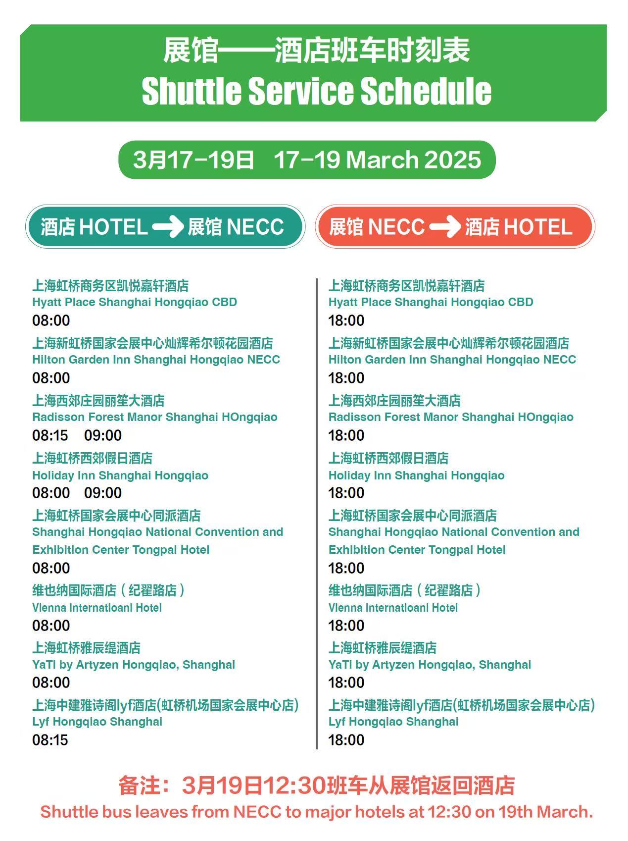 ◎接駁車(chē):部分酒店提供至展館免費(fèi)接駁班車(chē),班車(chē)時(shí)刻表如下。